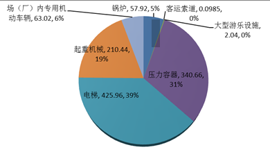 截至2015年底,全國特種設備總量達1100.13萬臺,比2014年底上升6.14%。其中:鍋爐57.92萬臺、壓力容器340.66萬臺、電梯425.96萬臺、起重機械210.44萬臺、客運索道985條、大型游樂設施2.04萬臺、場(廠)內機動車輛63.02萬臺。另有:氣瓶13698萬只、壓力管道43.63萬公里。