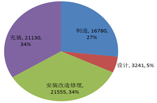 截至2015年底,全國共有特種設備生產(chǎn)(含設計、制造、安裝、改造、修理、氣體充裝)單位62706家,持有許可證68804張,其中:設計單位3241家,制造單位16780家,安裝改造修理單位21555家,移動式壓力容器及氣瓶充裝單位21130家。