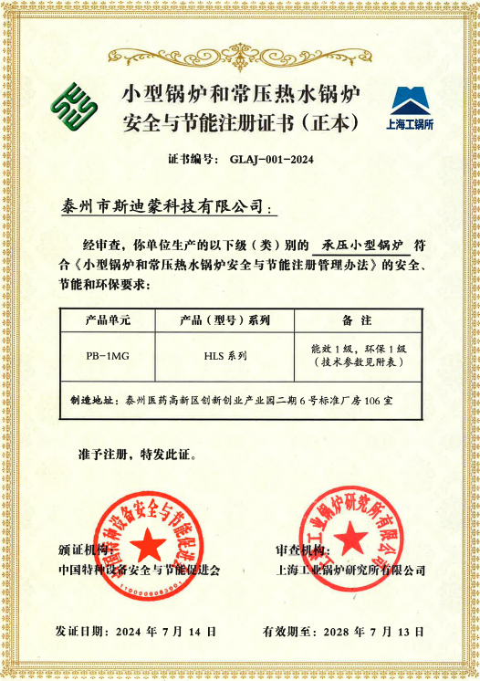 斯迪蒙科技有限公司獲頒首張小型鍋爐和常壓熱水鍋爐安全與節能注冊證書